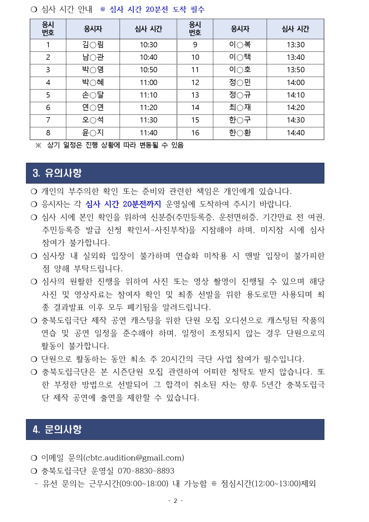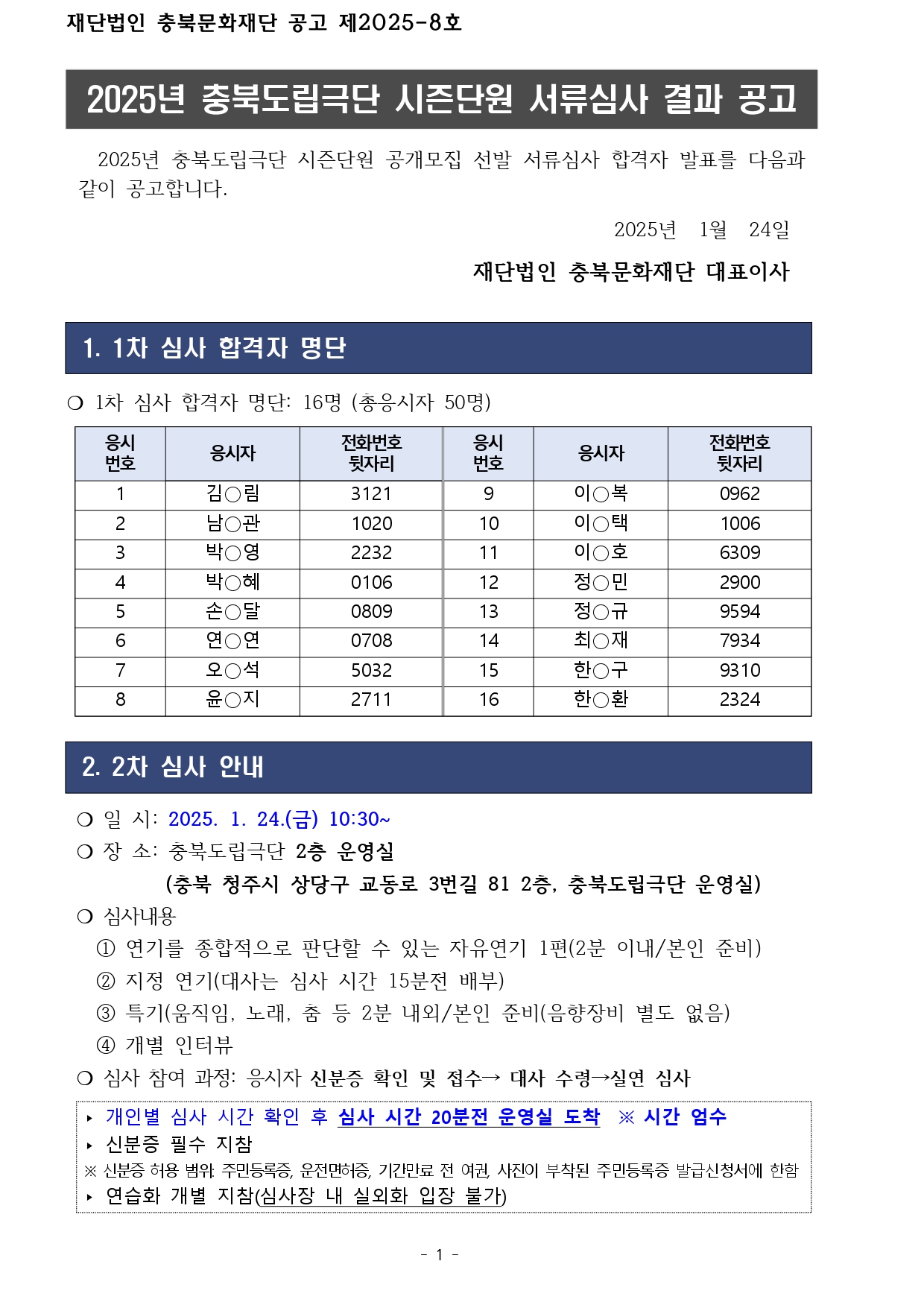 | 2025년 충북도립극단 시즌단원 공개모집 1차 심사결과 발표 | |||||