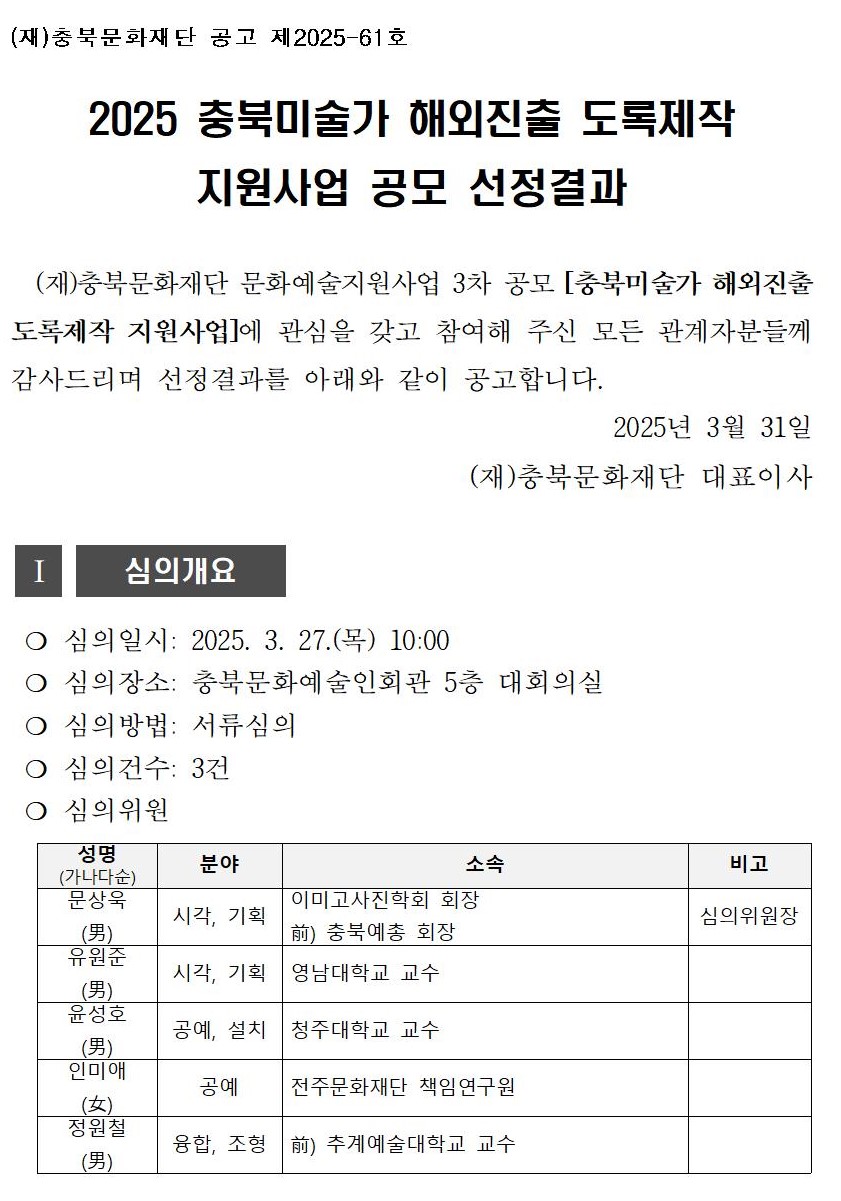 | 2025 충북미술가 해외진출 도록제작 지원사업 공모 선정결과 | |||||