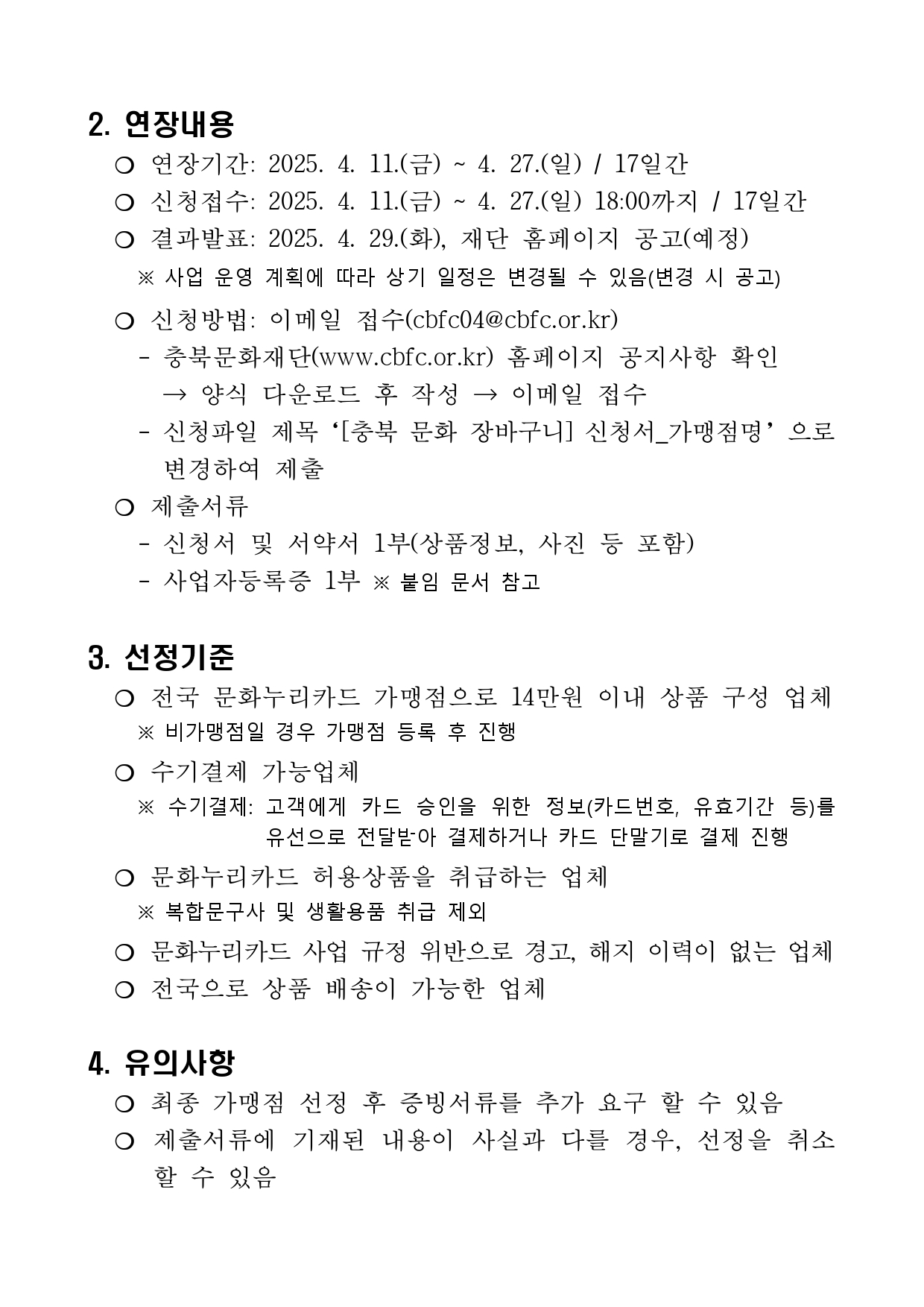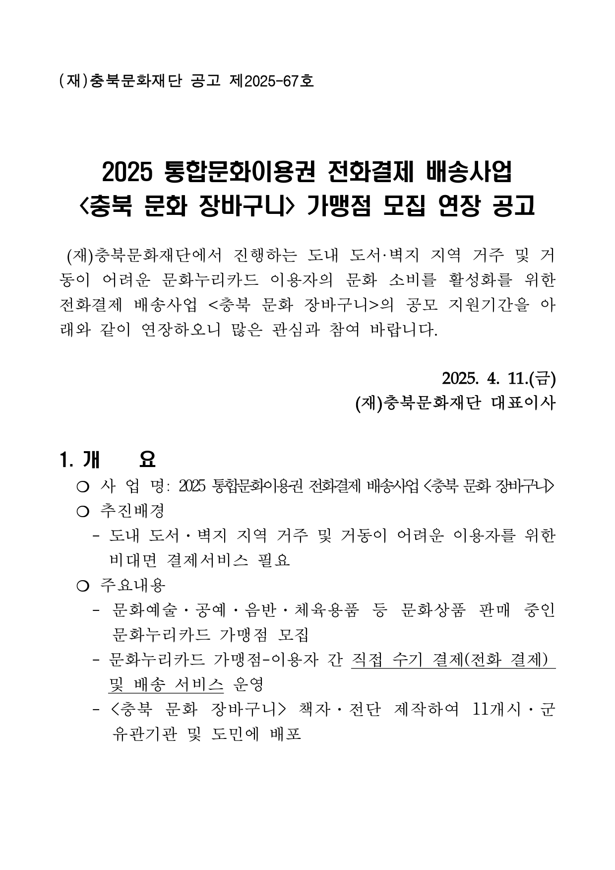 | 2025 통합문화이용권 전화결제 배송사업 [충북 문화 장바구니] 가맹점 모집 연장 공고 | |||||