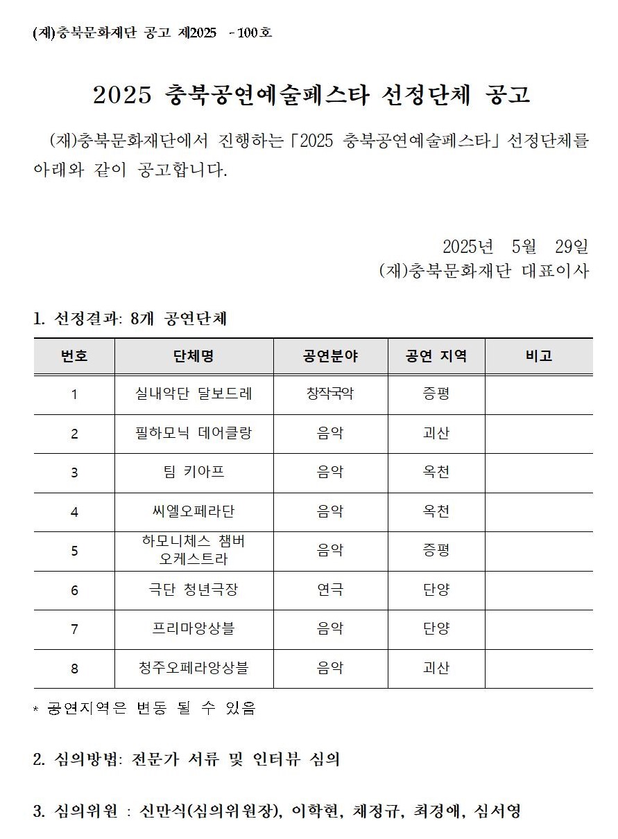 | 2025 충북공연예술페스타 선정단체 공고 | |||||