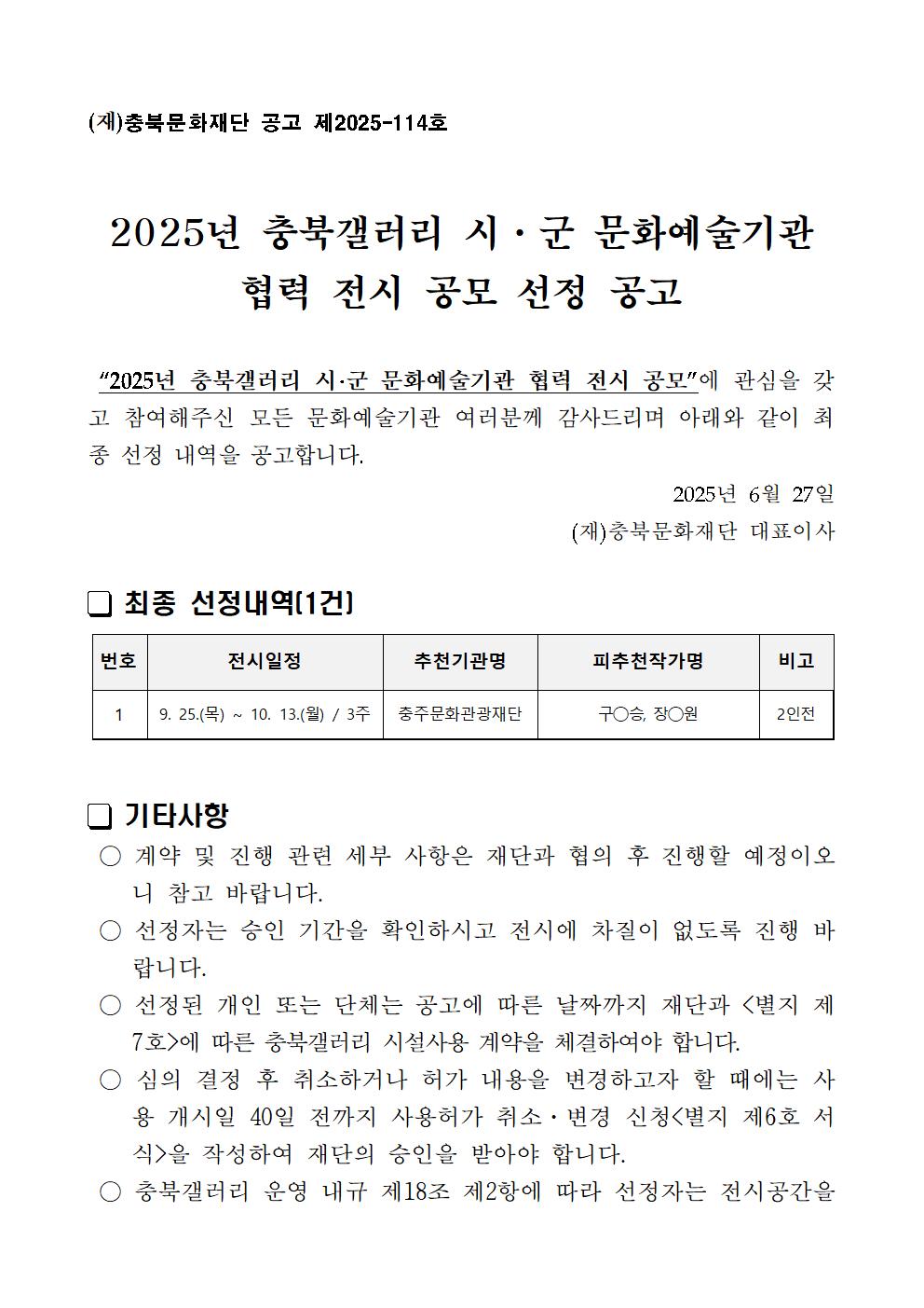 | 2025년 충북갤러리 시·군 문화예술기관 협력 전시 공모 선정 공고 | |||||