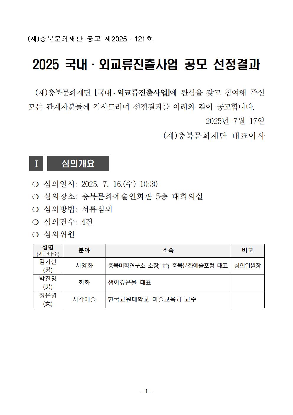 | 2025 국내외교류진출사업 공모 선정결과 | |||||