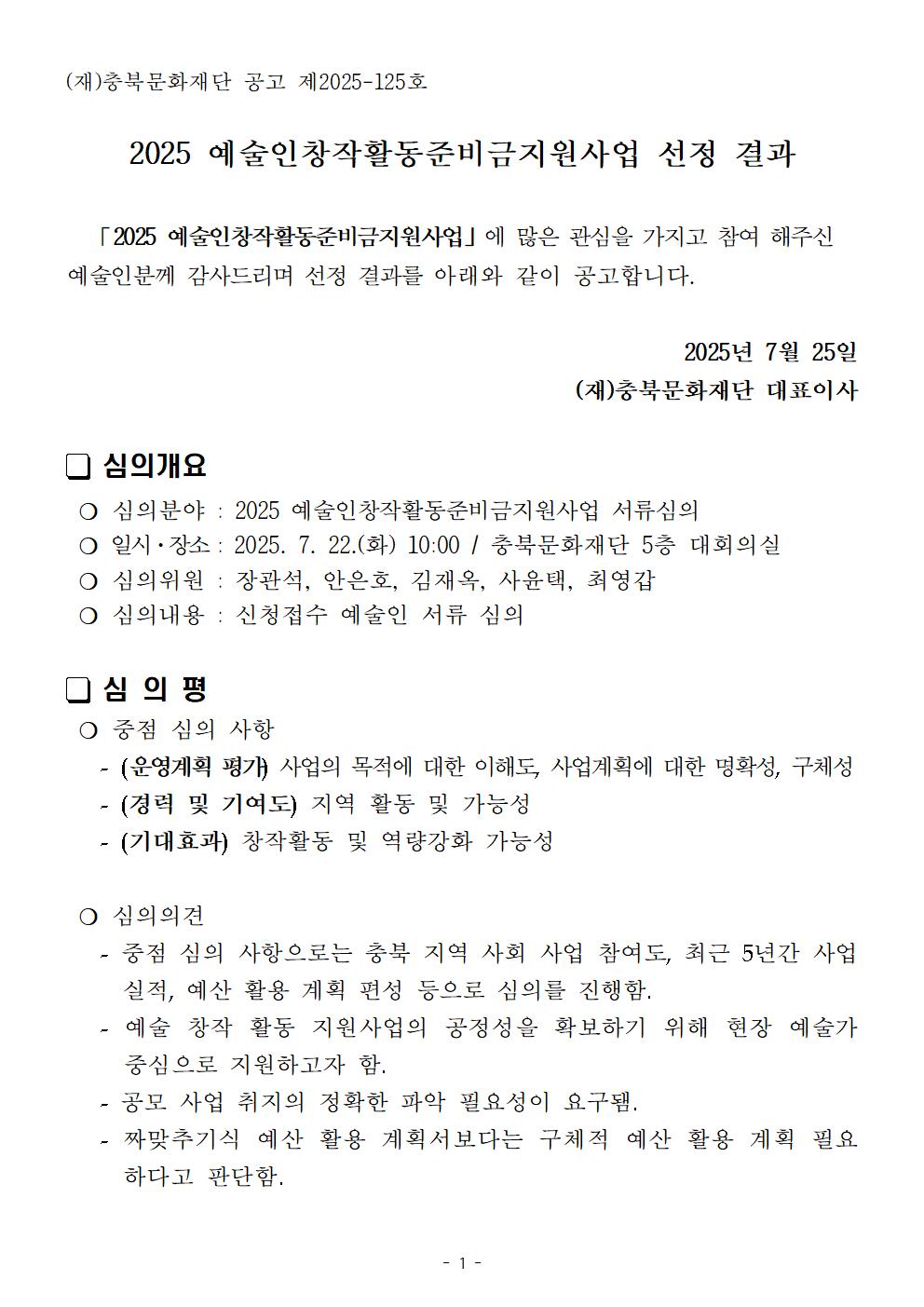 | 2025 예술인창작활동준비금지원사업 선정 결과 | |||||