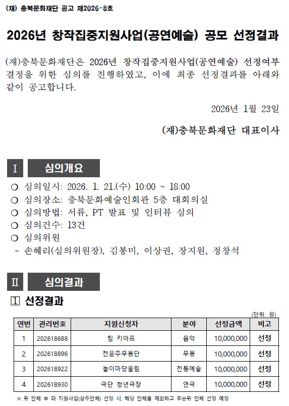 | 작성자 | 충북문화재단 | 등록일 | 2026/01/23 | 조회 | 607 |