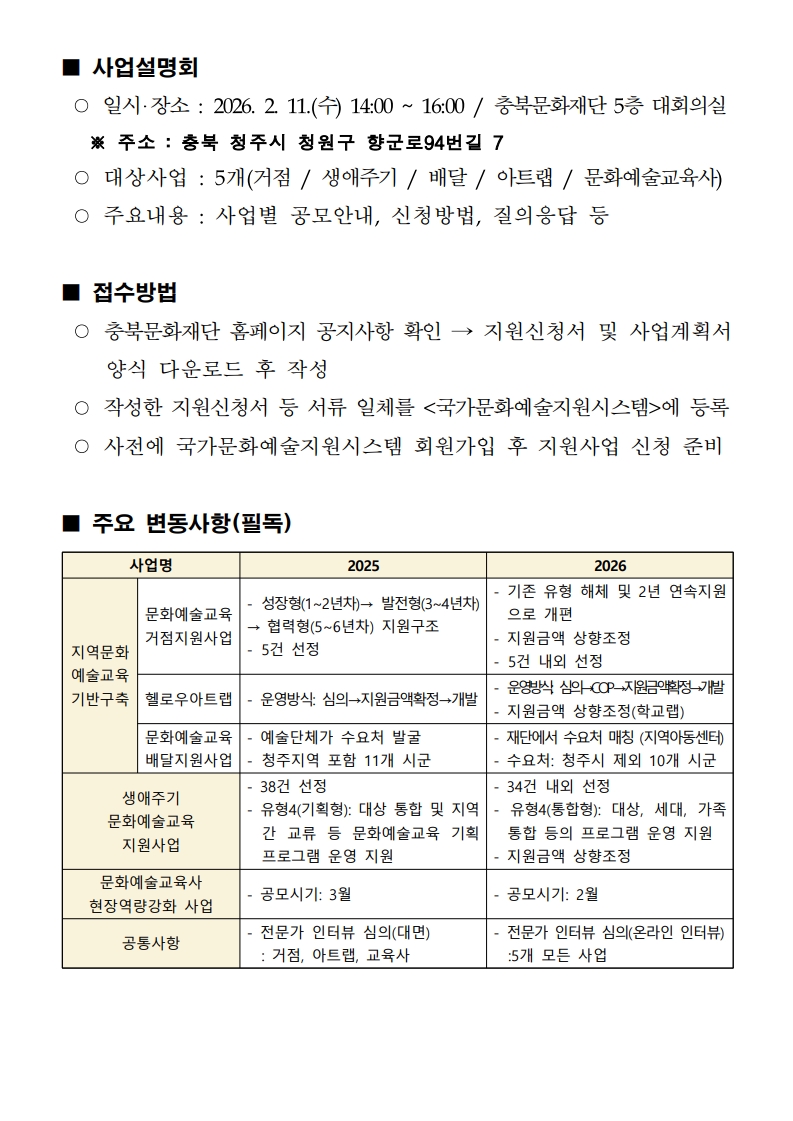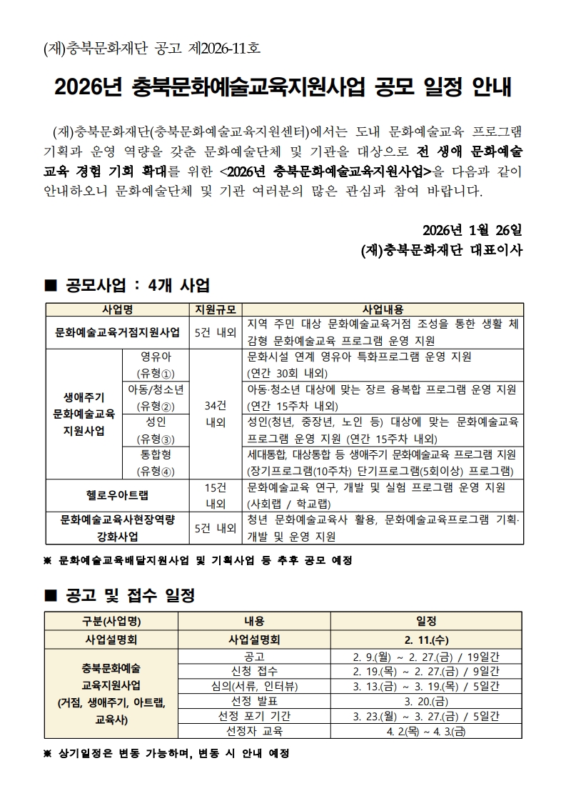 | 2026년 충북문화예술교육지원사업 공모 일정 안내 | |||||