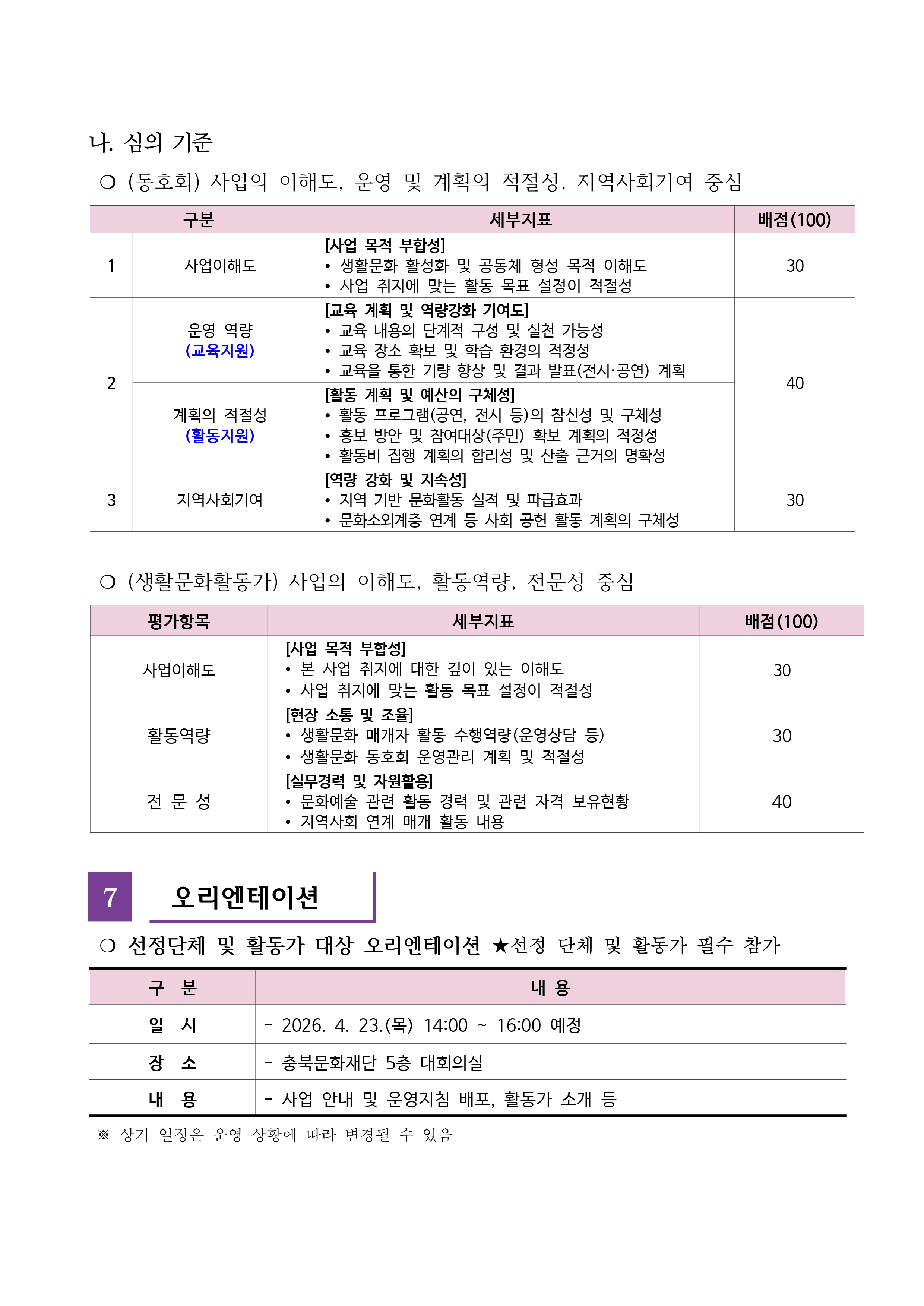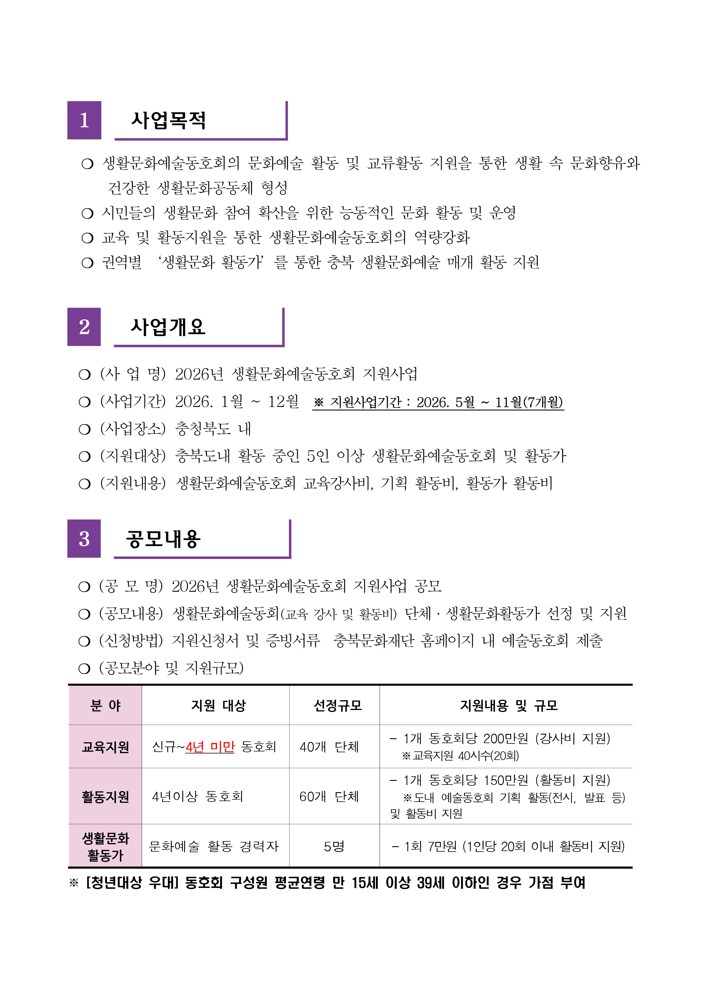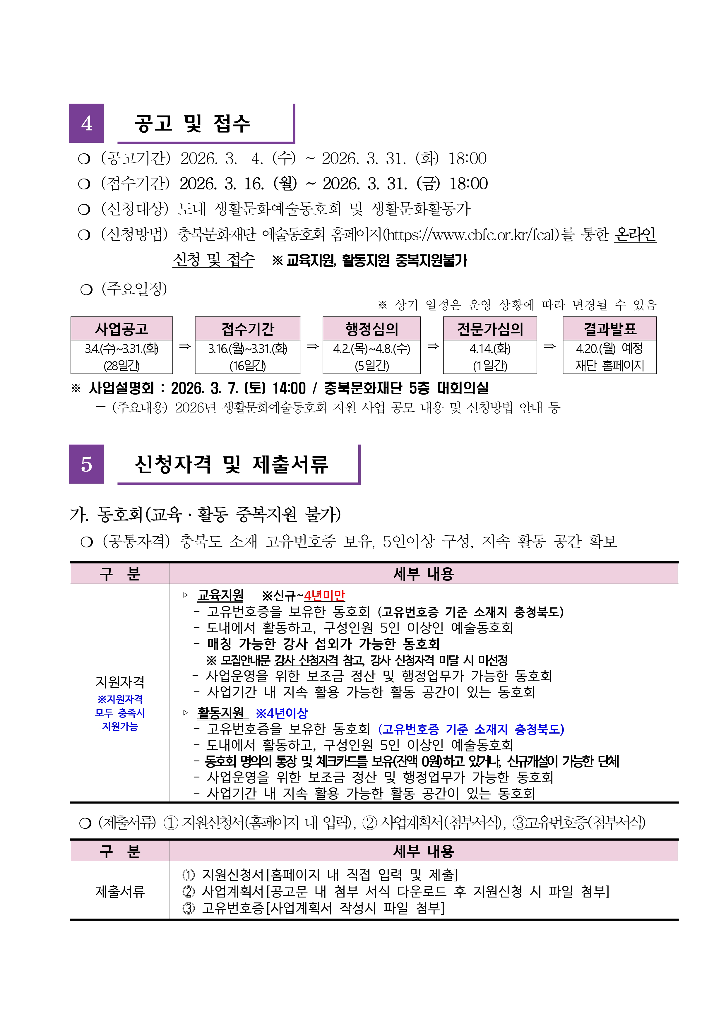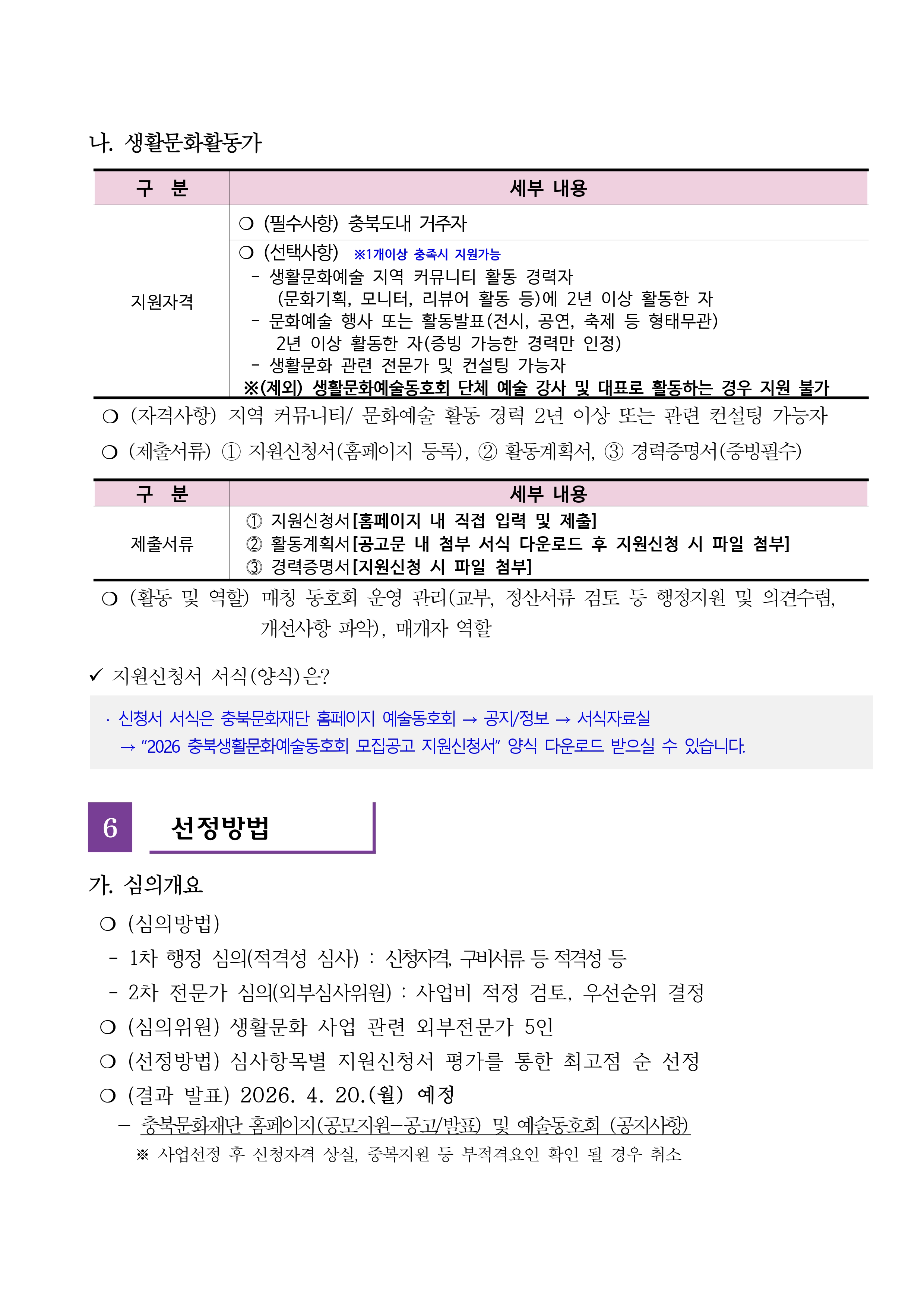 | 2026 충북생활문화예술동호회 지원사업 모집 공고(26.03.09 수정공고) | |||||