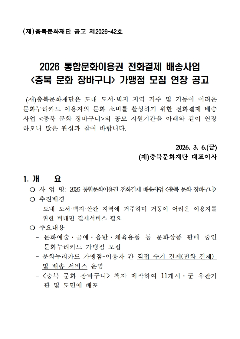 | 2026 통합문화이용권 전화결제 배송사업 <충북 문화 장바구니> 가맹점 모집 연장 공고 | |||||