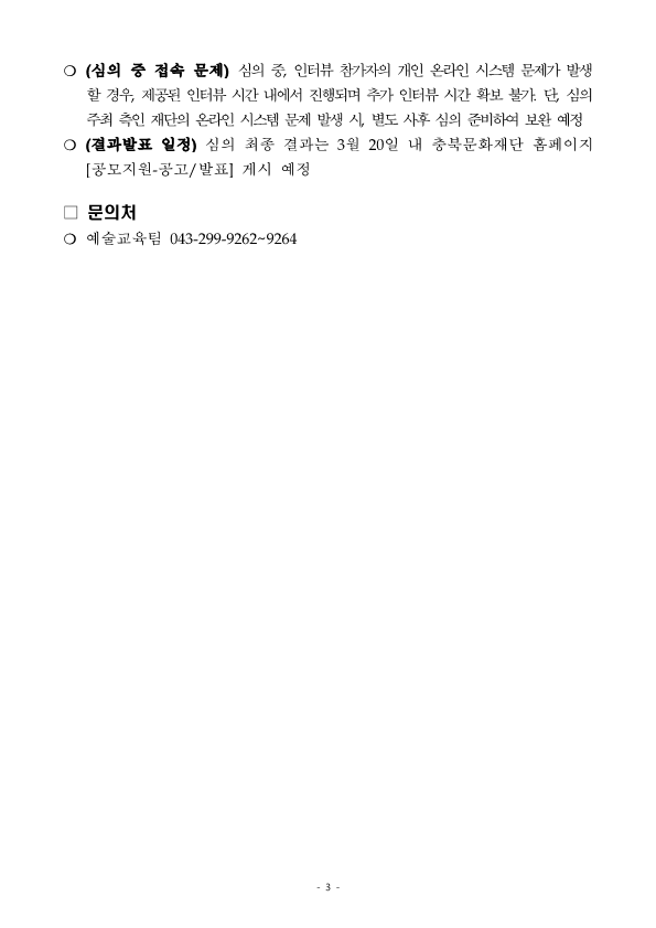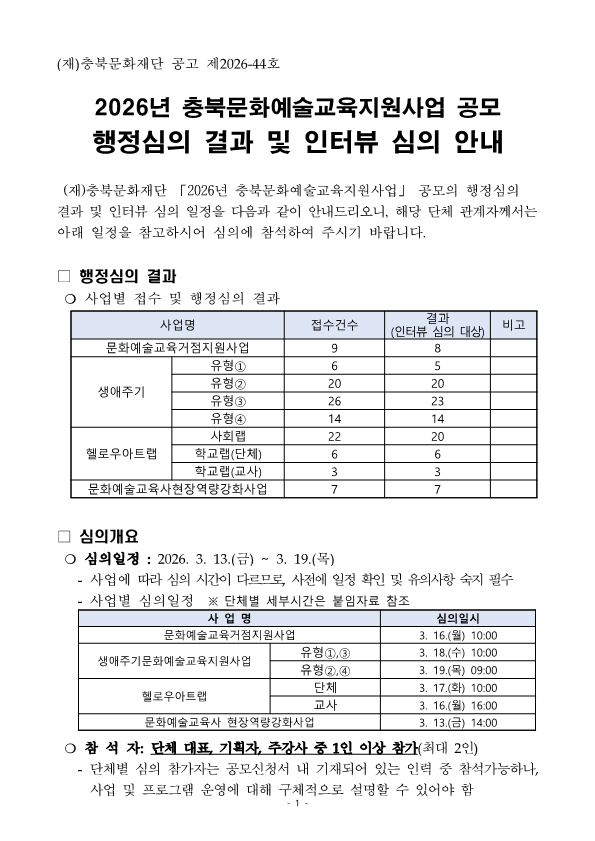 | 2026년 충북문화예술교육지원사업 공모 행정심의 결과 및 인터뷰 심의 안내 | |||||