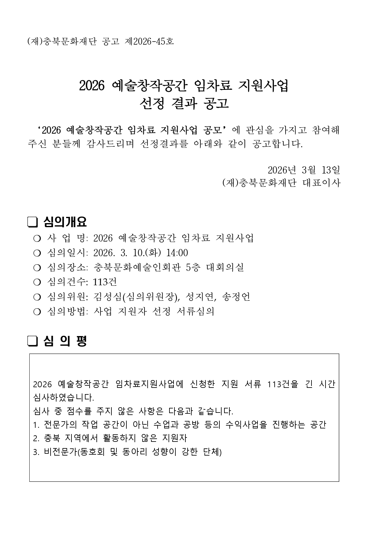 | 2026 예술창작공간 임차료 지원사업 선정결과 공고 | |||||
