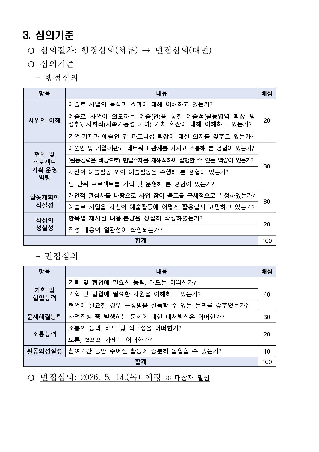 | 다음글 | 2026 예술인협업지원-예술로 기업·기관 결과발표일 변경 및 추가 모집 공고 |