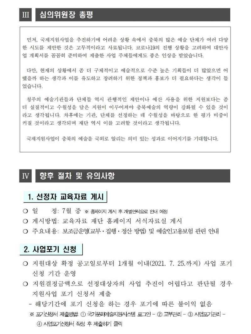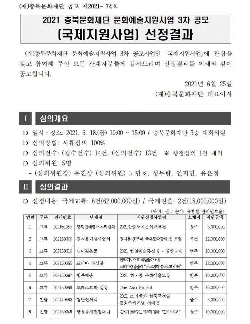 | 2021 충북문화재단 문화예술지원사업 3차 공모(국제지원사업) 선정결과 | |||||