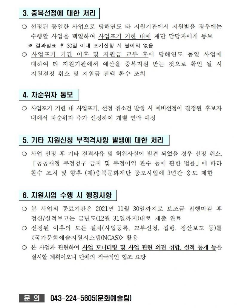 | 다음글 | 2021 충북문화재단 문화예술지원사업 3차 공모(충북형기획지원사업) 선정결과 |