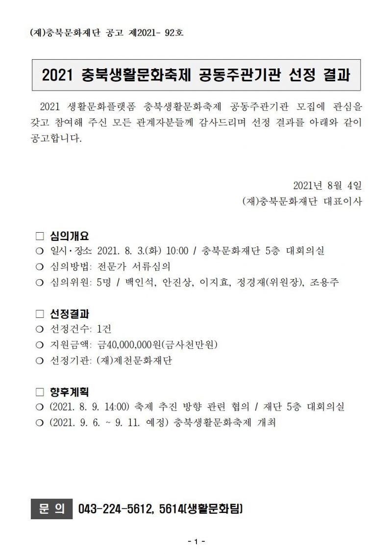 | 2021 충북생활문화축제 공동주관기관 선정 결과 | |||||