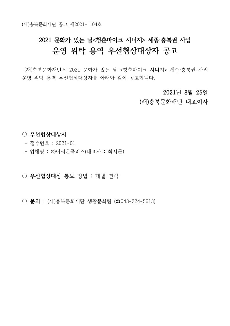 | 2021 문화가 있는 날 청춘마이크 시너지 세종, 충북권 사업 운영 위탁 용역 우선협상대상자 공고 | |||||