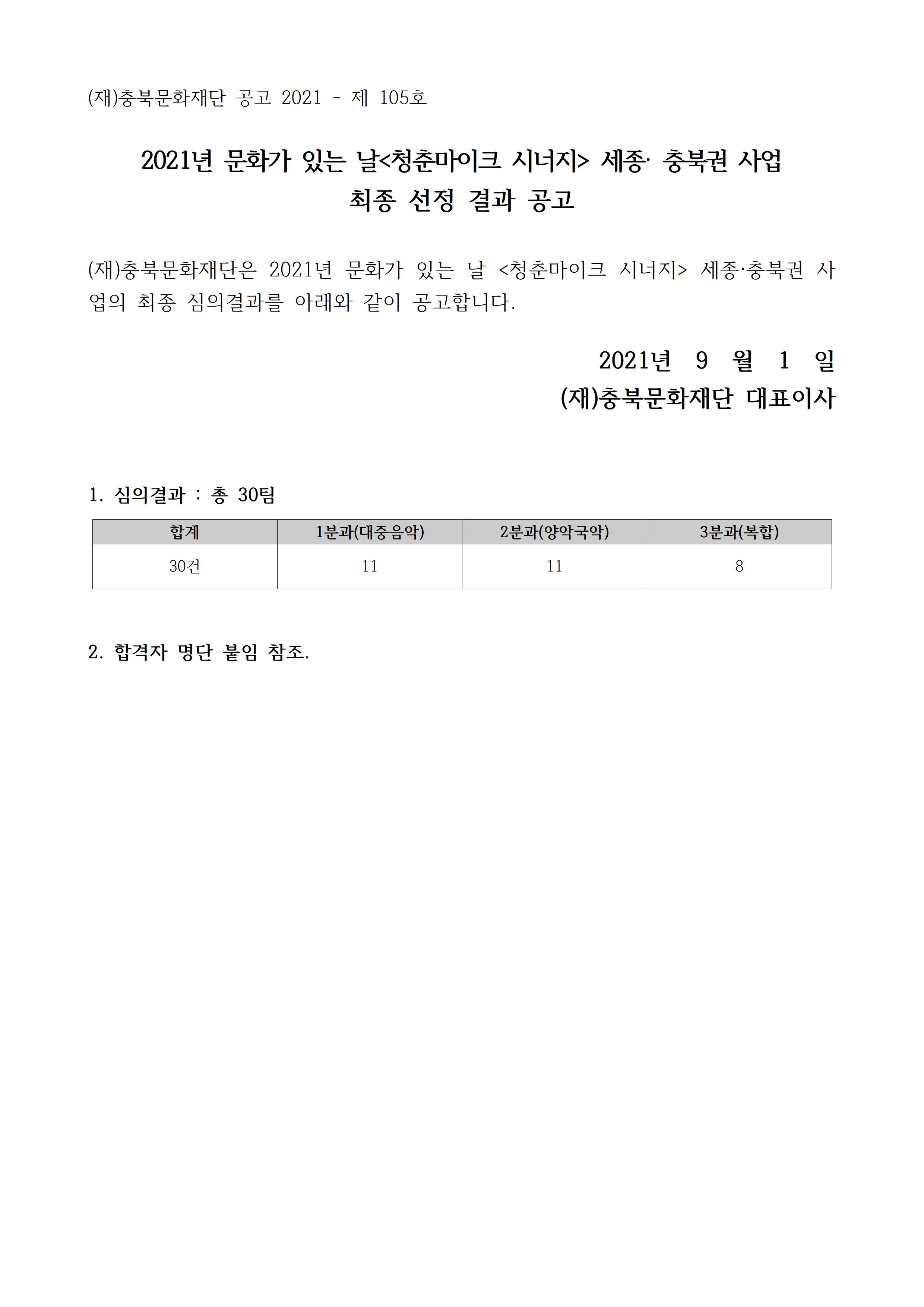 | 2021년 문화가 있는 날 <청춘마이크 시너지> 세종충북권 사업 최종 선정 결과 공고 | |||||