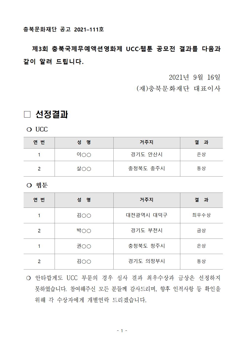 | 제3회 충북국제무예액션영화제 UCC·웹툰 공모 결과 공고 | |||||