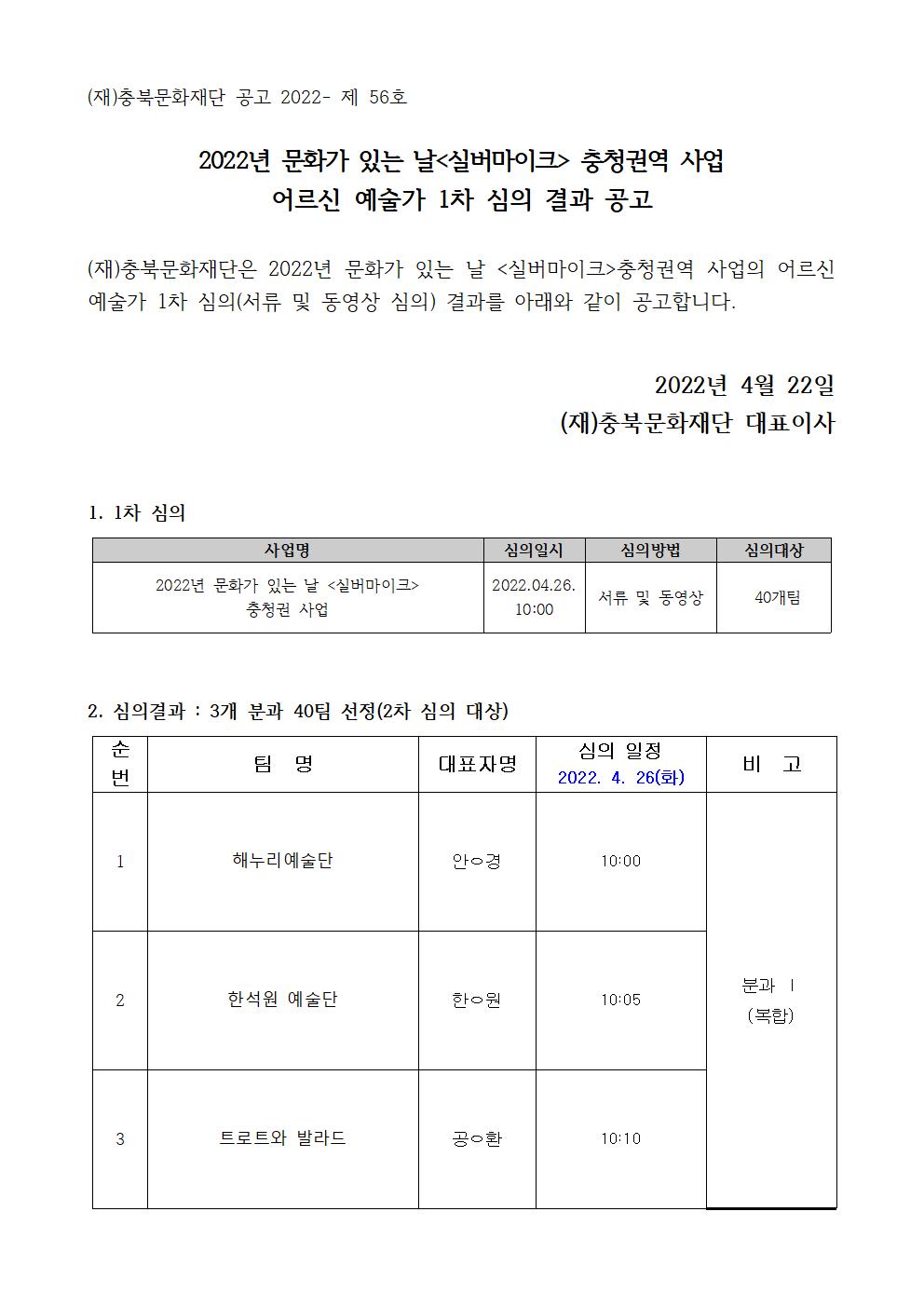| 2022년 실버마이크 충청권역 1차 심의 결과 | |||||