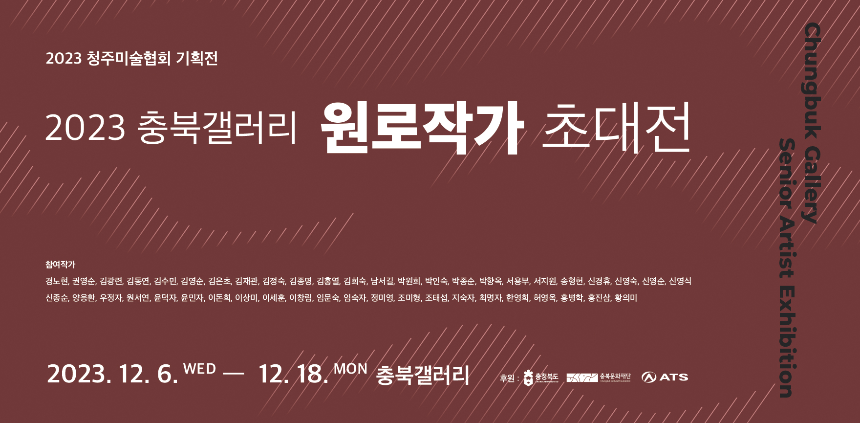 ● 참여작가 경노현, 권영순, 김광련, 김동연, 김수민, 김영순, 김은초, 김재관, 김정숙, 김종명, 김홍열, 김희숙 ● 기간: 2023. 12. 6.(수) ~ 12. 18.(월) 10:00 – 19:00 ※휴관일 없음 ●오프닝: 2023. 12. 6.(수) 15:00 ● 장소: 충북갤러리(서울특별시 종로구 인사동길 41-1 인사아트센터 2층) ● 후원 : 충청북도, 충북문화재단, ATS ● 문의: 충북갤러리(070-4224-6240) |