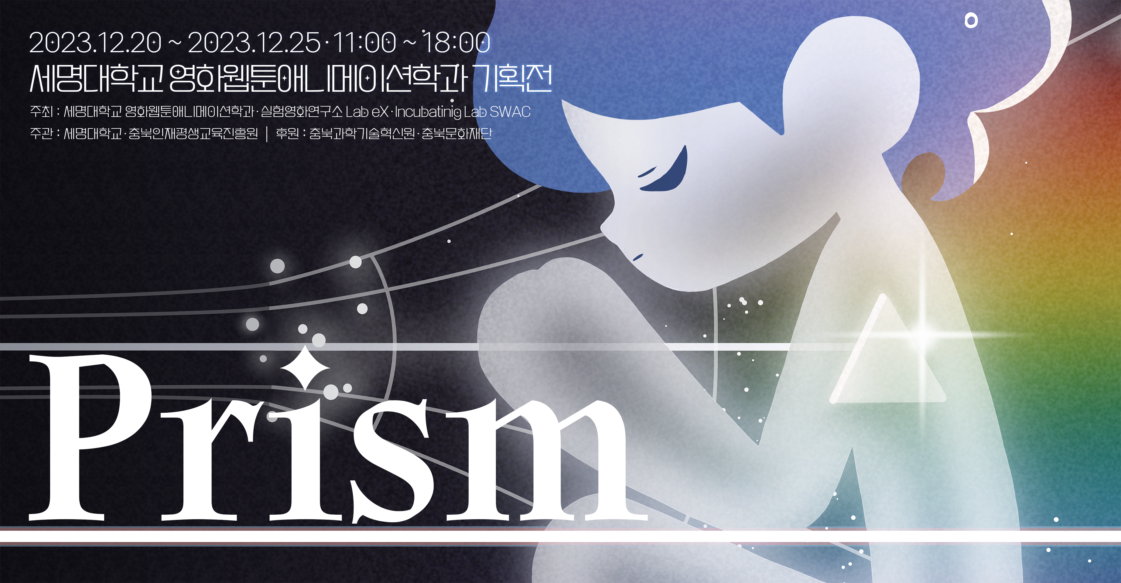 충북갤러리에서《프리즘(Prism)》이 진행됩니다. ‘세명대 영화웹툰애니메이션학과’와 부설 연구소인 ‘실험영화연구소 Lab eX’, 그리고 학과 기업 ‘Incubating Lab SWAC’의 콜라보 전시로 세 단체가 연합하여 지역 콘텐츠의 우수성을 보여주고자 합니다. (무료전시)