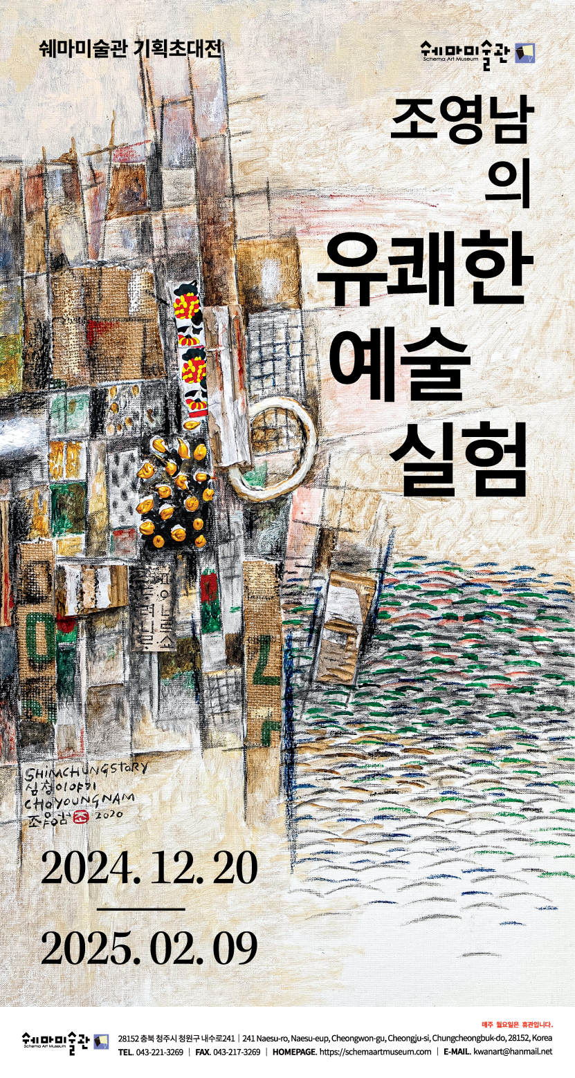 초대작가 : 조영남 전시기간 : 2024. 12. 20. ~ 2025. 02. 09 전시장소 : 쉐마미술관 전관 주최 및 주관 : 쉐마미술관 Artist Talk : 12월 21일 토요일 PM. 2:00~2:50 Opening Reception : 12월 21일 토요일 PM 3:00~3:30 Mini Concert : 12월 21일 토요일 PM 3:30~4:00
