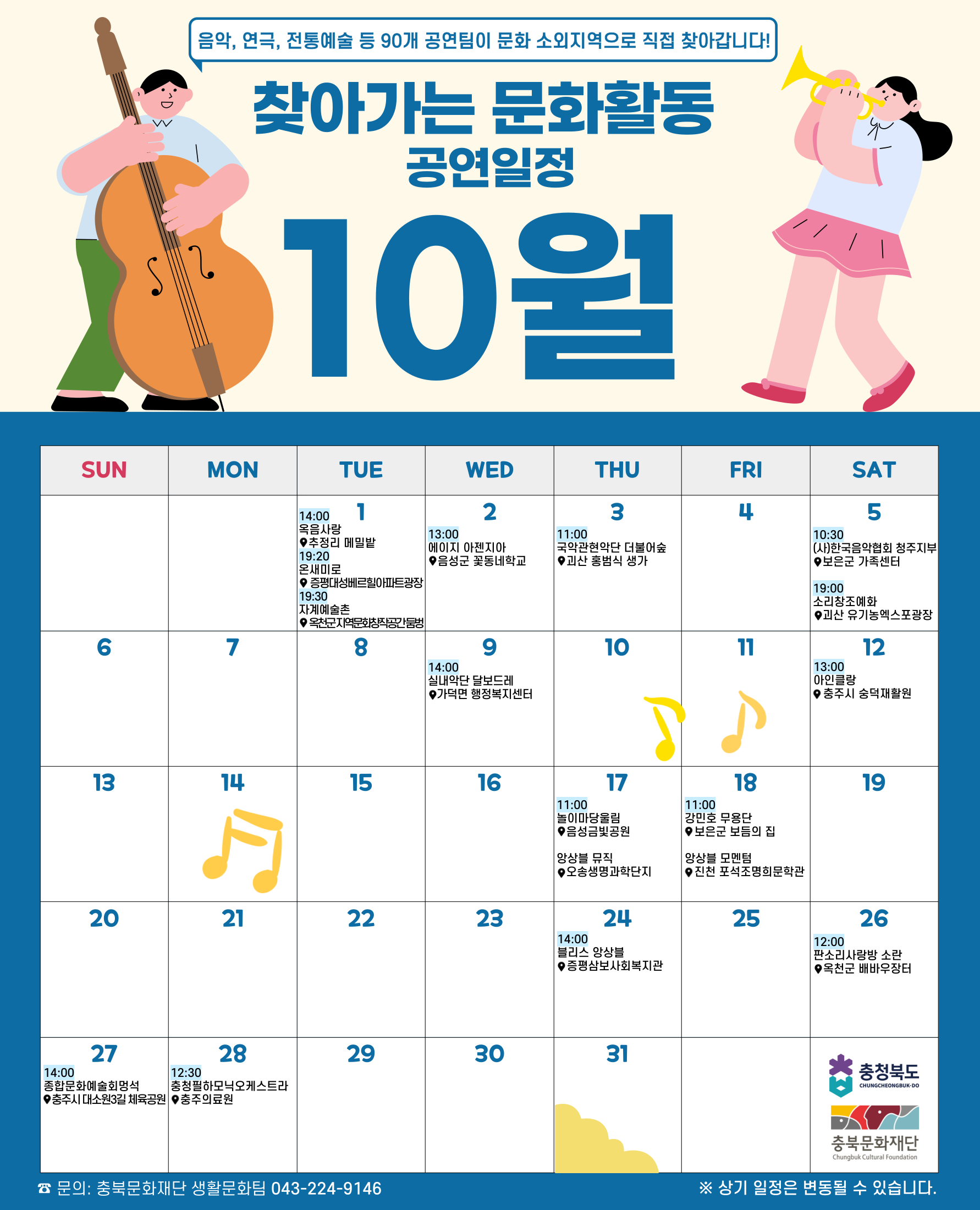음악, 전통예술, 무용, 연극, 예술일반 등 다양한 장르의 공연 팀이 충청북도 도내 11개 시군 문화소외지역으로 직접 찾아갑니다! 2024 찾아가는 문화활동 지원사업 10월 일정표 |