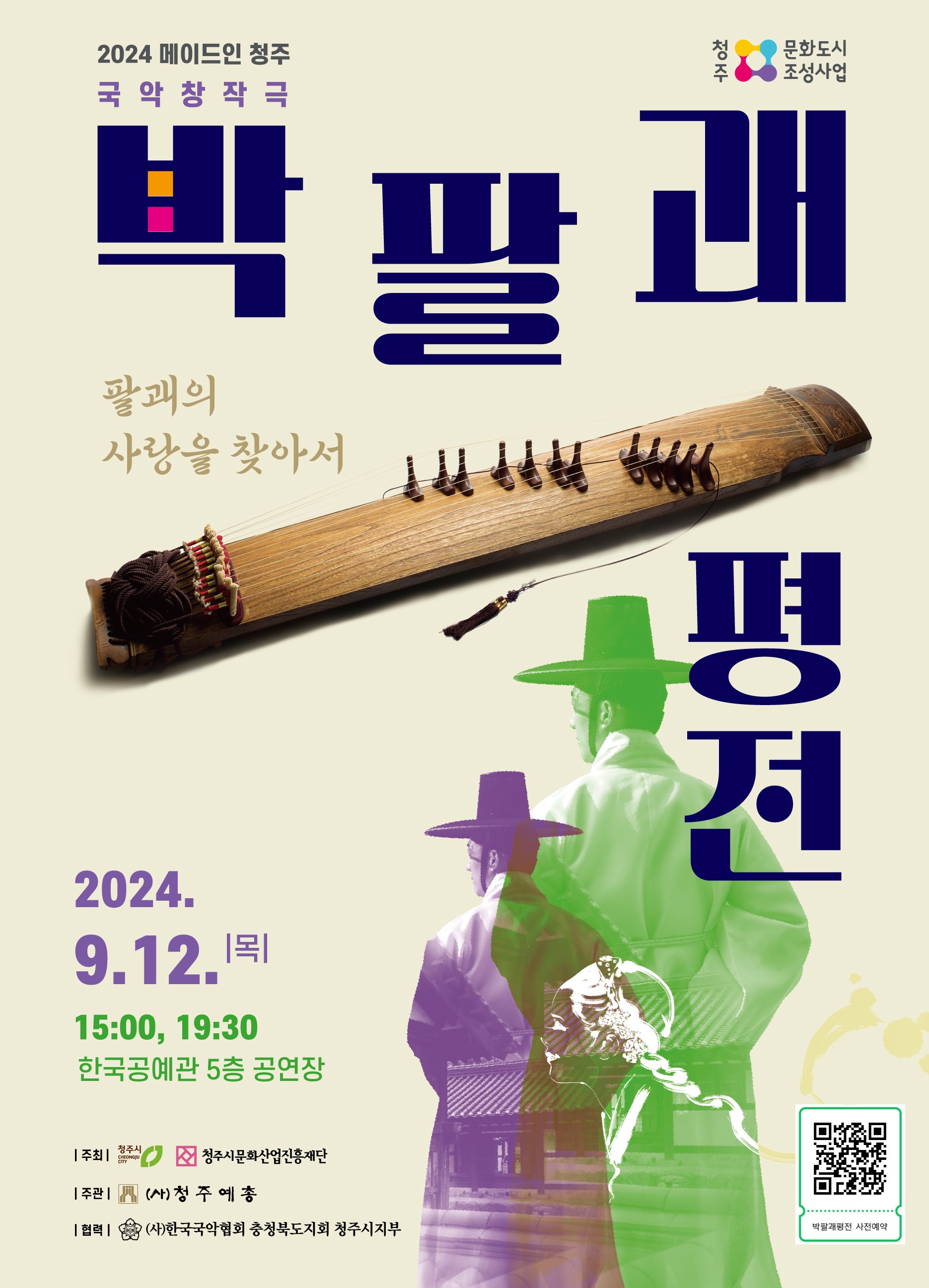 공연명: 박팔괘 평전 공연주제:팔괘의 사랑을 찾아서 공연일시: 2024. 9. 12.(목) 15시, 19시30분 (2회 공연) 공연장소: 청주한국공예관 5층 공연장(문화제조창 5층 다목적 공연장) 관람방법: 현장 선착순 무료 공연