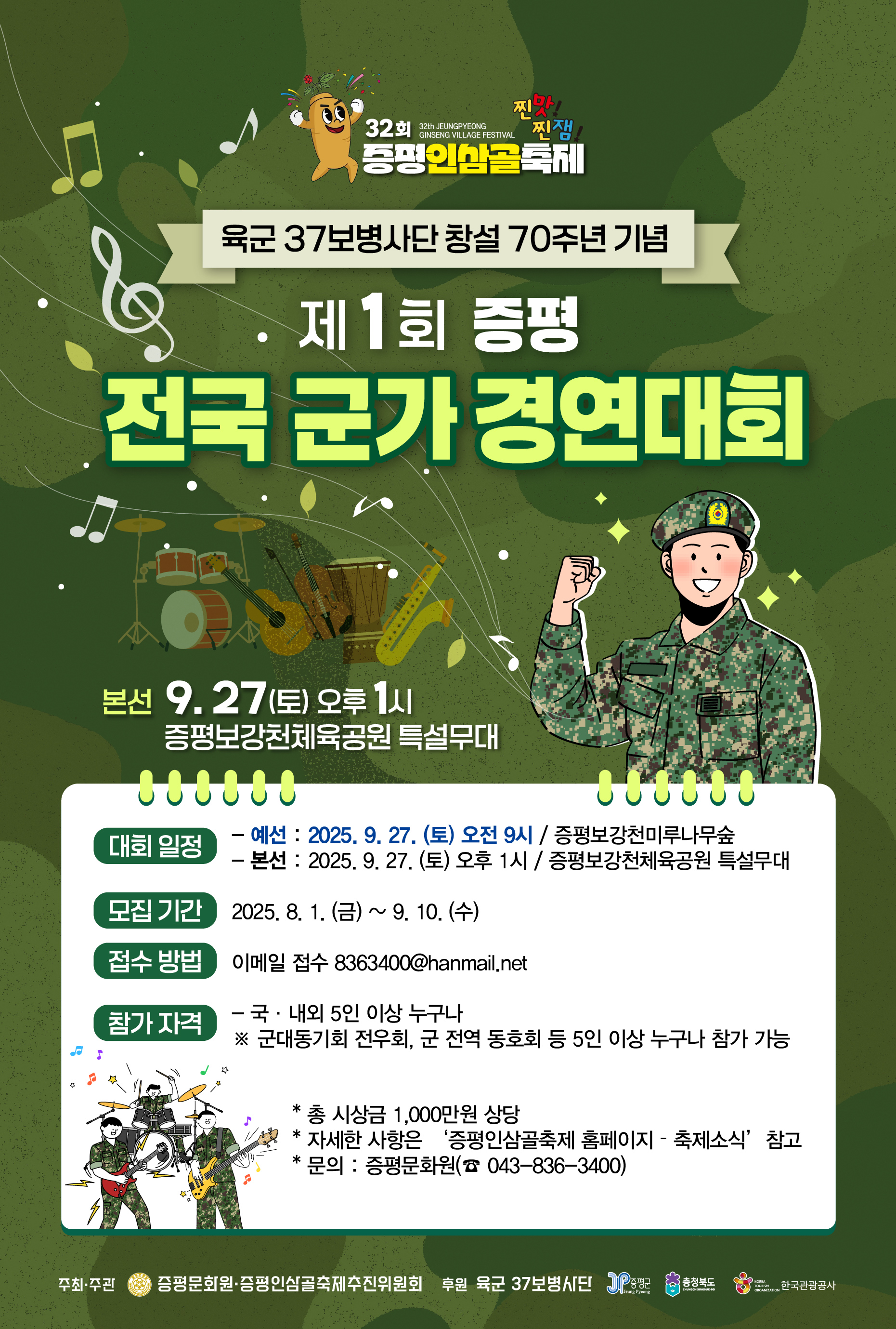 2025 “32회 증평인삼골축제”에 육군 37보병사단 창설 70주년 기념을 맞이하여 제1회 증평 ❝전국 군가경연대회❞가 개최됩니다!
