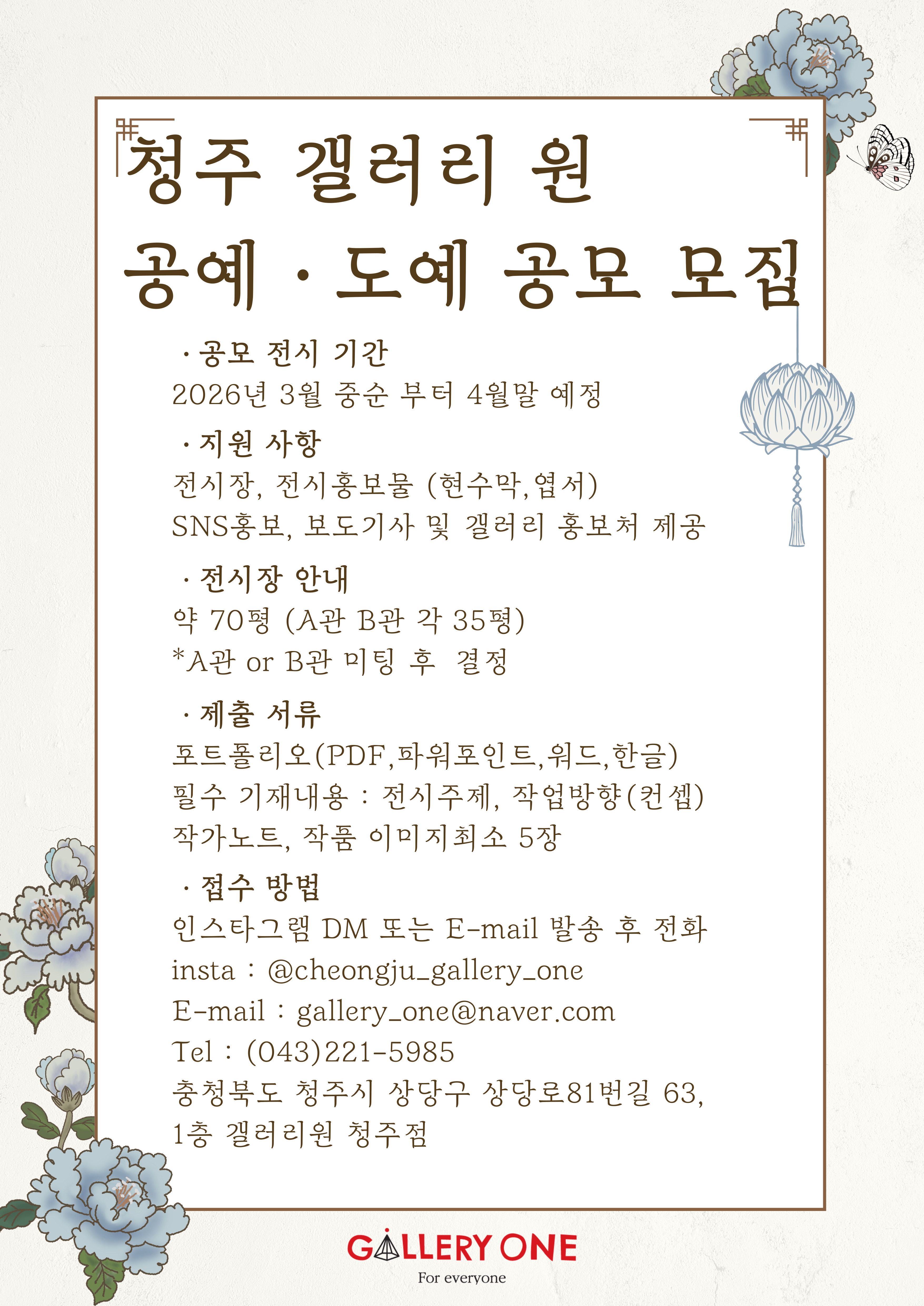 청주 갤러리원은 2026년 3월 중순 부터 4월말 전시를 함께할 작가님을 모십니다.