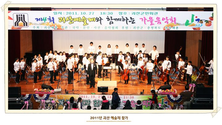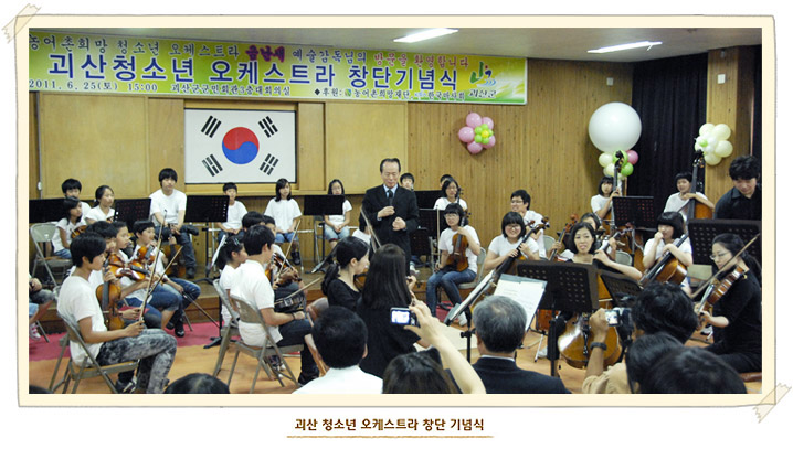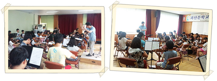 괴산에서는 작년 3월부터 다문화가정, 저 소득층 아이들을 대상으로 오케스트라 단원모집을 시작했고, 1년이 지난 지금 작지만 큰 성과들을 만들어 내고 있다. 처음 단원이 되어서 연습실에 모였을 때만 해도 다문화아이들은 어떤 말을 해야 할지 머뭇거리고 낯선 상태였지만, 1년이 지난 지금은 모두 하나의 오케스트라 단원이 되어있었다.
