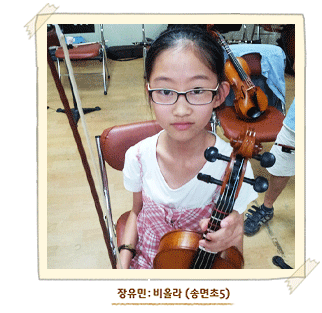 수줍음 많고 조용조용한 유민이는 비올라를 잡은지 채 1년이 되지 않았지만 연습시간 내내 악보와 지휘자의 손을 열심히 봐가며 열심히 연습중이다.
