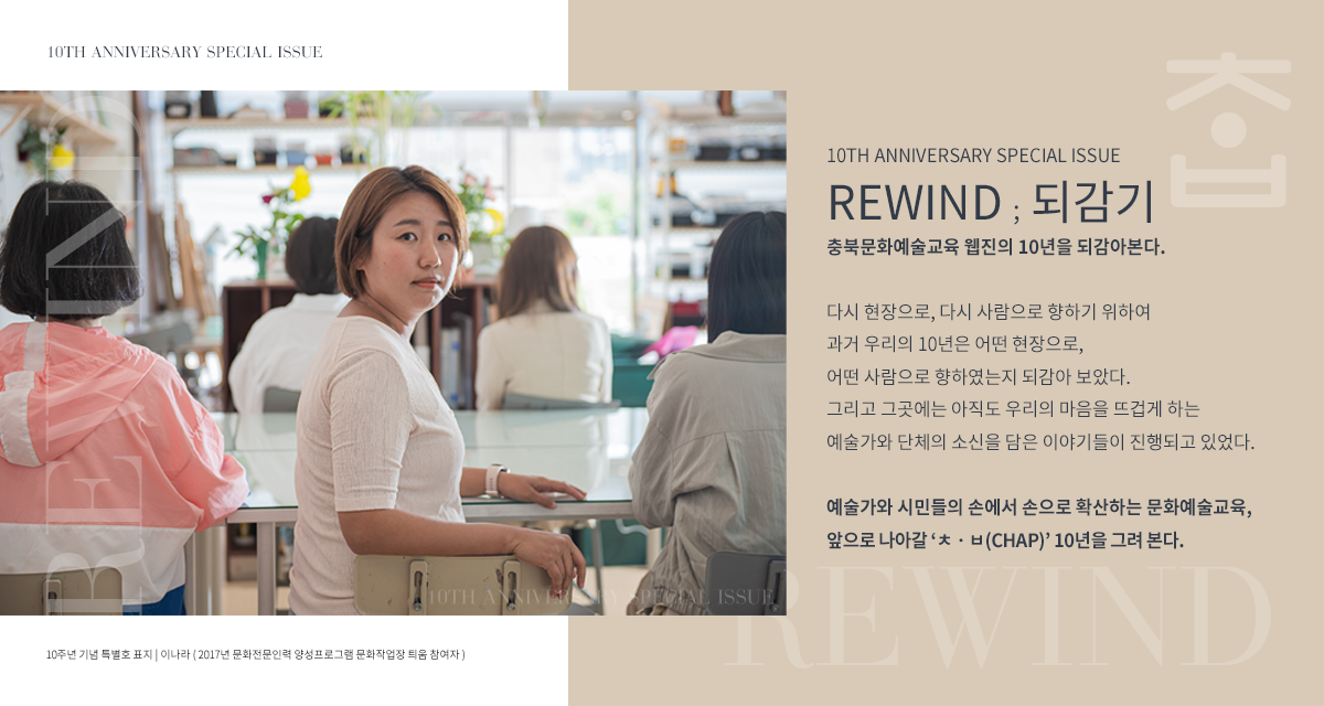 2022년 충북문화예술교육지원센터 웹진 ‘ᄎᆞᆸ(chap)’은 열린 편집인단 제도를 운영한다. 이번 호에서는 먼저 선정된 3인의 편집위원과 이들과 합을 맞춰 웹진을 꾸려갈 기록팀을 소개한다.