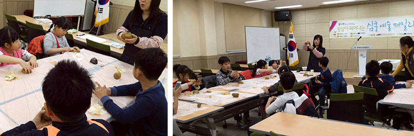 아이들은 손으로 흙을 만지며 각자의 개성대로 조물락 거리기 시작했다.