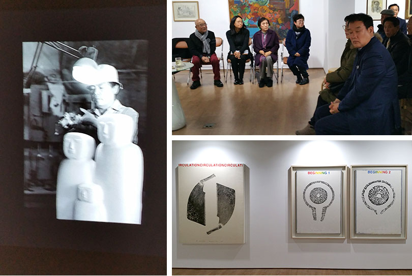 충북 옥천군 안남이 고향인 고(故)하동철(1942~2006) 화백은 서울대학교 회화과 학부와 대학원을 졸업하고 미국 탬플(Temple)대학교 예술대학원에서 판화를 전공했다. 서울대학교 미술대학장을 역임했으며 16번의 개인전과 수많은 그룹전을 열었다 특히 재경 충북작가전이 창립된 1976년부터 중앙과 지역화단을 연결시키고 충•남북을 아우르는 작가였다. 회화와 판화 탁본으로 작품을 분류할 수 있는 하동철 화백은 빛의 화가란 별명답게 빛이 중요한 미적 대상이다. 생전에 운동이나 다른 취미가 없이 오롯이 미술에만 심취해 1996년도에는 86점의 작품을 완성할 정도로 많은 작품들을 남겼다고 한다. 아버지가 돌아가신 후 보리밭 사이로 상여가 나갈 때 보았던 갈라진 보리밭에 비추는 햇빛의 영롱함과 끝없이 뻗어나가는 빛의 세계에 매료되어 빛을 예술작품으로 승화할 수 있었다는 하 화백 부인의 설명이 있었다.