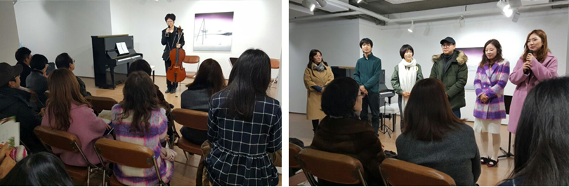 이내 음악회가 시작되었고 김보현 음악가가 작곡한 ‘여운’ 을 인트로로 콘서트가 전개되었다. 이어 두 곡이 연주되었고, 바흐의 곡이 연주될 즈음 첼로를 담당하는 고영철 음악가는 ‘무반주조곡 No.1 Prelude' 의 곡의 연주에 앞서 “2~30대 청년예술가들이 이제 사회생활을 시작한다고 볼 수 있다. 그런 의미에서 이 곡을 선보인다.” 라고 말해 젊은 예술가들의 진취적인 포부를 밝혔다. 이어 이어진 김민경 국악가가 부르는 ’경기민요연곡‘,’배 띄워라‘ 에서 각각 경기민요와 국악가요를 부르며 음악회의 흥을 돋구고, 이어 김다연 음악가는 플롯을 전자음악에 맞춰 선보이면서 미래적이고 몽환적인 분위기로 흡입력있는 무대를 보여주었다. 마지막 순서는 김보현 음악가 작곡한 ’청남대 가는 길‘을 선보이며 충북의 명소 ’청남대‘의 분위기를 음악적으로 표현했다. 이번 공연은 창작작품이 지배적인 것이 특징이었는데, 일부 곡에 대한 창작배경을 작곡가 ‘김보현’피아니스트와의 짧은 인터뷰를 통해서 더 자세히 알 수 있었다.