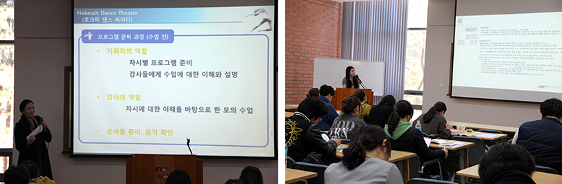 둘째 날은 타 지역 프로그램 우수사례인 단체 호크마댄스의 기획자이신 진윤희선생님의 사례공유로 시작되었다. 기획사업을 시작하게 된 계기와 삶의 목표, 꿈다락 토요문화학교사업의 프로그램 방향성과, 기획단계, 수업진행에서의 기획자, 주강사, 보조강사 각각의 역할과 프로그램 실제 적용 예시를 영상자료로 시청하며 공감대를 형성하였다. 곧이어 담당자가 꿈다락 토요문화학교 지원사업 안내 및 정산교육을 하였고, 올해부터 정부가 운영하는 국고보조금 통합관리 시스템인 e나라 도움 시스템 교육도 진행하였다. 특히 e나라 도움 시스템에 대한 질문이 끊이질 않았다.
