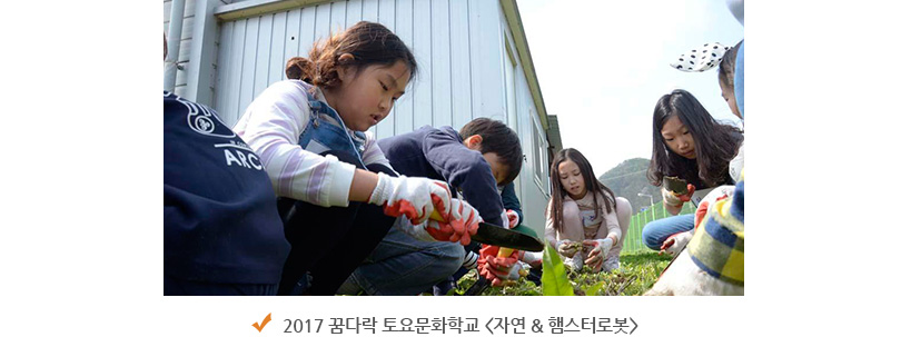<자연 & 햄스터로봇>프로그램은 로봇놀이와 목공놀이 그리고 사진·만화애니메이션 놀이로 이루어진다. 로봇놀이는 장르 통합과 영역별 체험을 통해 관심과 흥미를 유발하고 참여자들이 주체적으로 표현할 수 있도록 하는 프로그램이며 목공놀이는 일상적 문화를 소통으로 학습하고 관계의 유연성을 향상시키며 창의적 표현을 서로 교류하는 프로그램이다. 종합예술체험인 사진·만화애니메이션 놀이는 종합예술의 관점으로 새로운 것을 경험하고 흥미와 학습 동기를 유발시키는 프로그램으로