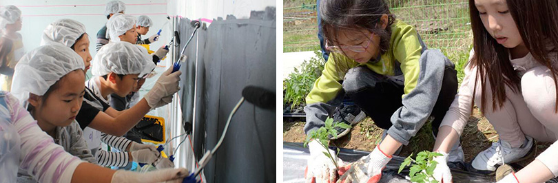 오늘은 아이들의 아지트 내부 인테리어를 위해 페인트칠을 하는 날이었다. 참여자는 스물 다섯명 정도로 선생님이 학년별로 나누어 이끌어주고 있었다. 각각의 모둠별 특징에 맞게 컬러를 선택하여 페인트칠을 했다. 이후에는 지난 시간에 이야기하여 정한 딸기, 브로콜리, 토마토, 상추, 옥수수 등 다양한 작물을 심었다. 아이들은 직접 땅을 일구고 돌을 고르고, 잡초를 뽑고, 밭이랑을 만들어 비닐을 씌우는 등 모종을 심는 전 과정을 함께 하였다. 모두 마친 후에는 자장라면을 간식으로 먹었다. 참여 아이들이 많아 연신 재잘대며 산만한 듯 보이지만, 세 분 강사선생님께서 아이들을 일사분란하게 이끌어주셨다.