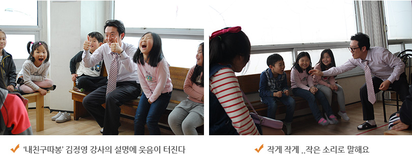 “내 친구 따봉... 내 친구 따봉... 내 친구 따봉...” 목소리를 점점 크게 하다가 점점 작게. 둥그렇게 둘러앉은 아이들은 엄지손가락을 내보이며 옆 친구에게 이야기한다. 그때마다 여기저기서 까르르 까르르 웃음이 터져 나온다. 내수 지역아동센터(센터장 김풍숙)에서는 화요일 오후가 되면 연극수업이 진행된다. 어린이들에게 연극을 가르치고 있는 김정영(연극배우·주강사)강사는 아이들의 순수한 모습을 보면서 오히려 자신이 더 많이 배워가고 있다고 말한다.