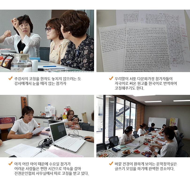 문학카페는 진천지역의 주부들이 모여 마음속에 묻어둔 이야기를 꺼내 수필을 쓰고 서로의 글을 나누는 모임이다. 주부들의 글쓰기 모임이라고 해서 글의 완성도 보다는 그저 훈훈한 이야기들만 넘치겠지 라고 생각한다면 큰 오산이다. 매주 자기가 써온 글들을 직접 낭독하고 주강사님의 코칭과 참가자들의 의견을 서로 나누는데 글 실력도 대단하지만 서로의 코칭 수준도 상당히 진지하고 전문적이다. 더욱 놀라운 것은 고향이 한국이 아닌 다문화가정의 주부들이 띄엄띄엄 읽어내려가는 글들도 웬만한 한국인보다 더 감동적이고 자연스러운 문장들로 이루어져 있다는 것이였다.