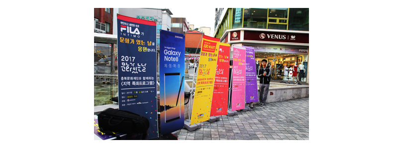 문화가 있는 날 행사 제천 지역 담당 김규열님: “저는 평소에 소통할 수 있는 문화에 관심이 많았습니다. 문화가 있는 날 사업은 원거리 상권의 살아있지 않은 문화 활동 문제를 해결하기 위해 만들어진 것입니다. 저 또한 문화도 살고 지역 상권도 함께할 수 있는 프로그램을 찾다보니 이러한 좋은 프로그램을 만나게 된 것 같습니다. 상권에서는 아무래도 문화 활동을 거리에서 할 때 행사 전후로 거리 교통이나 환경적으로 애매한 부분들 때문에 살짝 달가워하지 않으신 면이 있어 애초에 상권에서 품고 있는 불만이나 문제점 등의 현장의 소리를 들어봤어요. 그래서 이러한 과정을 통해서 거리에 위치한 여러 상권들의 이름을 새긴 배너들이 탄생되었어요. 배너 안에는 매마수 행사의 이름과 각 상가의 이름, 그리고 상권 분들이 원하는 메시지 등을 넣었어요. 상호 간에 홍보가 되고 서로가 참여할 수 있도록 유도하는 하나의 방책이 되길 바라면서요. 이 문화의 거리에 오면 문화 활동이 진행되고 있다는 것도 좋은 일이지만, 상권과 시민들도 같이 공생할 수 있는 것, 그게 관건이라고 생각해요. 그래서 앞으로는 상권과 시민과 아티스트 모두가 자발적으로 행사에 참여할 수 있는 방법을 강구해 나갈 계획입니다.”