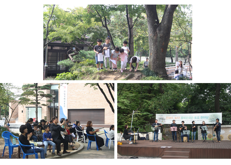 9월의 네 번째 토요일 오후, ‘문화야, 놀자!’는 공연, 미술, 놀이, 생태 숲 체험 등 더욱 다양한 프로그램을 가지고 하반기의 시작을 알렸다. 충북문화관 야외공연장은 문화와 놀기 위해 참여한 어린이와 가족들로 어느새 시끌벅적하다.
