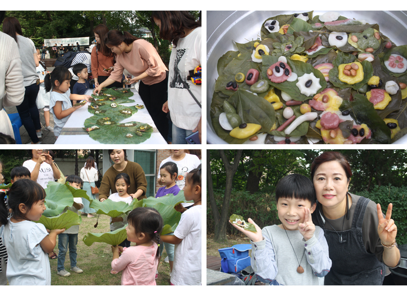 떡을 쪄 줄 솥을 뒤로 하고 아이들은 우산만한 연잎을 하나씩 받아들었다.