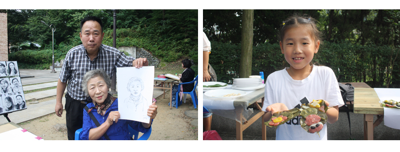 연으로 놀기, 떡 만들기 체험 외에도 마당 한쪽에 마련된 ‘인물화 그려주기’ 부스에 앉아 그림의 주인공이 되어보는 시간과 ‘사오정앙상블’이 부르는 노래 공연이 있어 이 날의 프로그램은 더욱 풍성했다.
