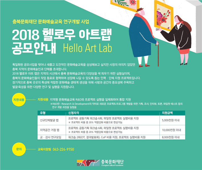 충북문화예술교육지원센터는 “획일화된 공모사업을 벗어나 새롭고 도전적인 문화예술교육을 상상해보고 싶지만, 사정이 여의치 않았던 충북 지역의 문화예술인과 단체를 초대”하며, “헬로우 아트 랩은 지역의 시선에서 충북 문화예술교육의 다양성을 싹 틔우기 위한 실험실”이라고 밝혔다.