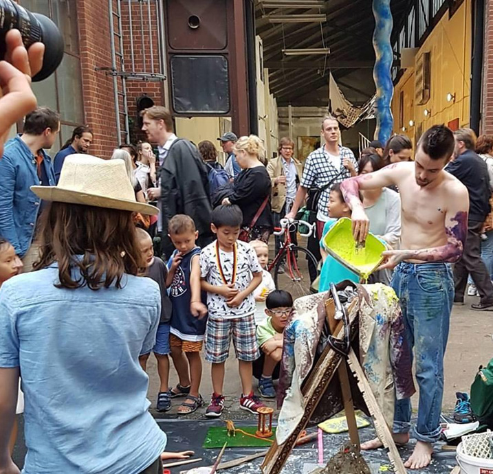 ❷ 입구에서 퍼포먼스를 하고 있는 어느 작가의 모습과