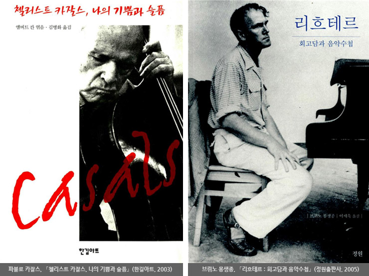 어느 음악평론가는, 카잘스가 연주한 바흐의 〈무반주 첼로 모음곡〉 을 들으면 바다가 보인다고 했다. 카잘스의 첼로는 논일로 거칠어진 할아버지의 두툼한 손바닥이다. 밭매기에 거칠어진 할머니의 생채기투성이 손바닥이다. 당신들의 손바닥으로 손주의 가려운 등을 쓸고, 아픈 배를 쓸어준다. 카잘스의 연주는 듣는 이들의 다사다난한 영혼을 가만히 쓸어내리는 치유의 선율ㅇ다. 카탈루냐 민요를 연주한 〈새의 노래〉 는 스페인 내전으로 세상을 떠난 이들에게 바치는 진혼곡이자 살아남은 이들의 울음-노래다. 리흐테르가 연주한 슈베르트의 〈피아노 소나타 21번〉 (D.960) 1악장을 들으면, 안개 자욱한 새벽 숲을 서성거리는 한 사람이 떠오른다. 한 걸음 한 걸음 여명을 향해 묵묵히 걸어가는 고독한 실루엣이다.