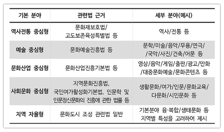 지역이 무엇인지 정의하기 애매하기 때문에 지역 문화 진흥을 위한 정책은 사업 실행의 편의성을 위해 타 지역과의 차별성이라는 관념에 지배적으로 사로잡히는 경향이 있는 것 같다. 예를 들어, 문체부의 문화도시 인증 정책은 각 도시의 정체성을 역사전통 중심형, 예술 중심형, 문화산업 중심형, 사회문화 중심형, 지역 자율형으로 나누어 지원하겠다고 한다.
