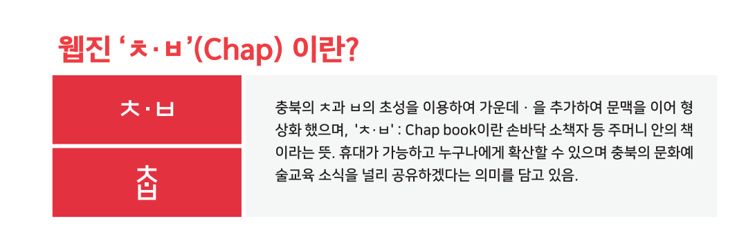 2019년 충북문화예술교육지원센터 웹진‘ㅊ‧ㅂ’ 결과자료집에 실린 웹진의 의미. 가로로도 세로로도 다양하게 활용될 수 있도록 고안되었다.